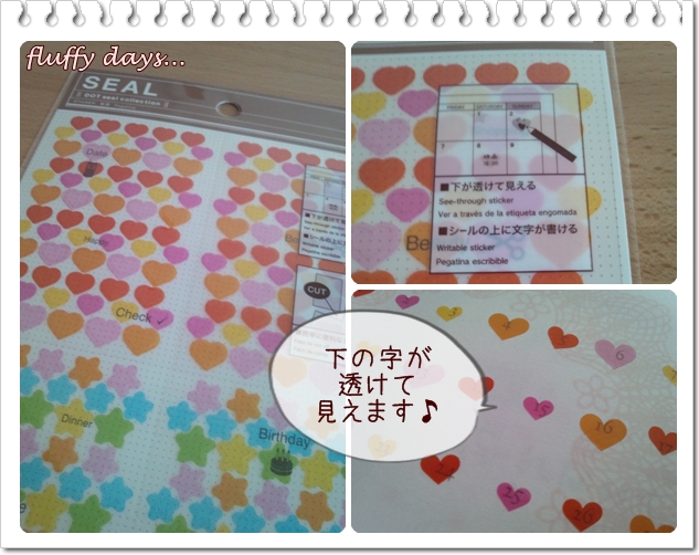 ほかのかわいいシールでもやってみましたが、1シートあたりの枚数が少ないので、片面終わる前にシールがなくなってしまい、途中でどんどんシールが変わってしまうのが気になってしまいました。だからといって、同じシールを何枚も買うのはイヤで、結局このシールに戻ってきました。。。