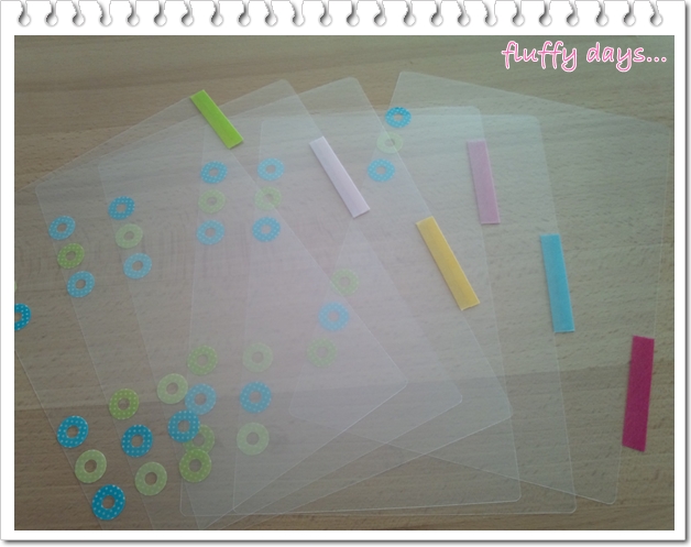 ④カットで落とした角を丸めて、穴を空けて、穴を補強するためのシールを貼ったらできあがり。