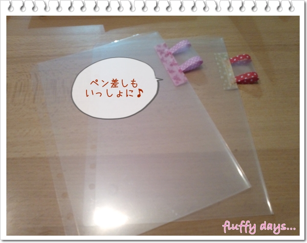 ハギレのように取っておいた他のクリアホルダーの切れ端を足して、こども手帳用のペン差しを作りました。