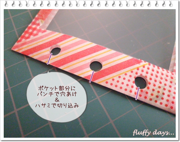 10) ポケット部分にパンチで穴をあけ、穴の横にハサミで切り込みを入れる。