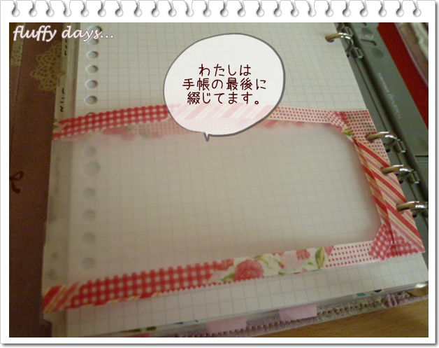 わたしはいつも手帳の一番最後、携帯用パンチの前に綴じています。よく着け外しするので、パッと開きやすいところが使いやすいような気がします。