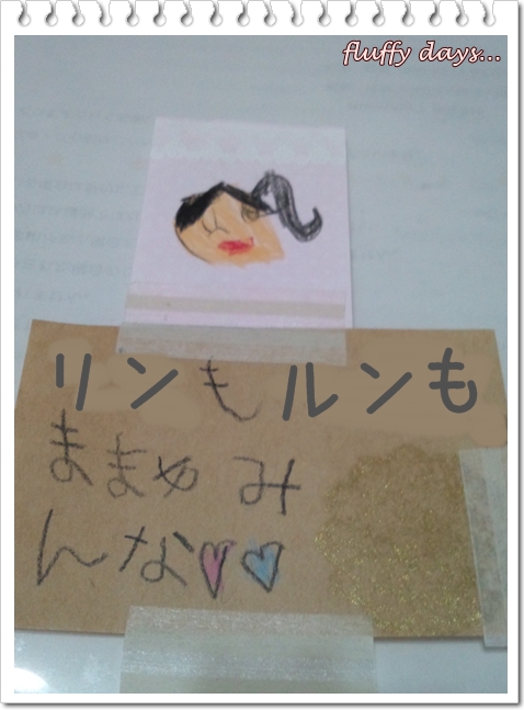 リンがわたしの真似をしてフセンに書いてくれたお手紙とわたしの似顔絵。フセンの粘着力だけでは心配なので、マステで留めてあります。