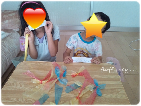 家にあった赤・青・黄色のリボンを使い、リボンを作っていきます。リンが一生懸命作る横で、ただビニール紐を切り刻むだけのルン。。。 お掃除が大変そうよ^^;