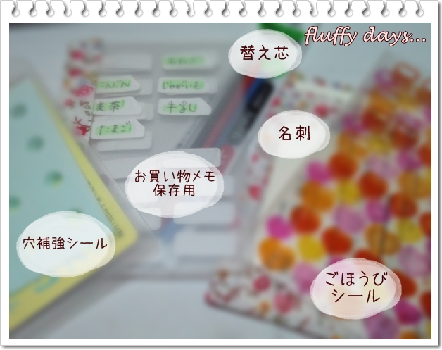 このジッパー付きの袋、文房具屋さんの手帳コーナーでも売っていますが、わたしが使っているのは100円ショップで買ったものに6穴パンチで穴を空けたものです。